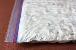 Food grade wrapping paper and perforated polyethylene bags are the most suitable materials for packaging tempeh. They have demonstrated good retention of the quality of tempeh and extension of the shelf life of tempeh for three days compared to fresh tempeh. Appropriate packaging is important as it provides optimum oxygen supply and temperature for inoculation and fermentation to occur during processing.[26] Tempeh is a perishable food and must be wrapped and placed into the refrigerator or freezer immediately after incubation or other processing steps such as blanching. In the refrigerator or freezer, stacking of tempeh should be minimized to prevent overheating and the undesirable, gradual continuation of fermentation, both of which shorten the storage life of tempeh. Even under cold temperature, tempeh continues to respire and undergo slow decomposition from microorganisms and its natural enzymes. Therefore, tempeh should be well cooled for at least two to five hours in a cooler before it undergoes further packaging.[19] Tempeh packaged in perforated polyethylene bags is usually repacked inside another labeled, non-perforated bag for distribution, sale and easier labeling. If the tempeh is packaged in only one perforated bag, the label must be directly attached to the perforated surface with the use of government food contact approved adhesive.[26] It is then bulk packed in cartons and returned to the refrigerator or freezer to await shipment.[19]