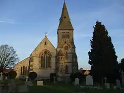 The parish church of St. Andrew was entirely rebuilt in 1875 to a design by Frederick Preedy[8] on the site of an older edifice.[2] Consisting of a chancel with a north organ chamber and vestry, nave, north aisle, and a south-west tower serving as a porch, it is built of lias stone with sandstone dressings, and has tiled roofs. On the north wall of the chancel is a repainted stone shield of arms of the 17th century with the six quarterings of the Woodchurch-Clarke family, impaling the quarterly coat of De la Hay, Winterbourne, Sheldon, and Ruding. In the organ chamber is a 17th-century oak chest with panelled sides, a carved top-rail, and a panelled lid.