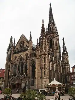 Until 1858, the former parish church of St. Stephen stood at the location of the current building. The originally late Romanesque building from the 12th century was expanded at the beginning of the 14th century in the Gothic style. A substantially higher choir was added to the nave. In 1510, the Romanesque bell tower was remodelled in the style of the Renaissance. In 1707, the bell tower was crowned with an onion dome. In 1857, the city council of Mulhouse decided to replace the place of worship, which had come to be looked upon as dilapidated, by a new building. The city architect Schacre, who had already constructed the main synagogue of the city and the Catholic St. Stephen's Church, designed a church in the neo-Gothic style with a simple, rectangular ground plan without a transept and choir. In contrast to the long Catholic church, it was a squat, but very wide building. The bell tower, which is visible from quite a distance away, stands behind the building, in contrast to its model on the Freiburg Minster. The current church was built between 1859 and 1866. Since February 2009 and prospectively until late 2019, the church is subjected to a progressive restoration of all its exterior and interior parts. The work had started with the complete scaffolding of the steeple.[2]