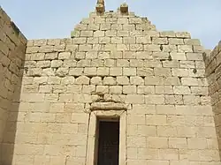 The Temple of Anahita is a large rectangular room in the shape of a cube in a depression 6 meters above the ground, each side of which is nearly 14 meters. It is built of carved stones without mortar, double-walled, and in the Achaemenid architectural style. These stones are connected to each other with iron fasteners. A staircase from the palace was also connected to this temple. The temple has no roof and the purpose was to bring the water of the Shapur River, which flows 250 meters away, into the temple, so that after flowing inside the temple, it would be discharged through a Qanat.[8][9]