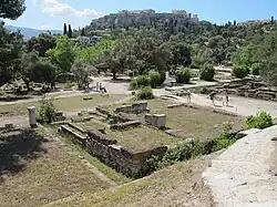 After this, the area was left empty, as indicated by a set of benches built behind the temple in the mid-fifth century BC, looking east over the Agora.[8][9]