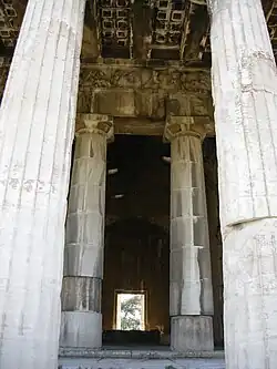 The dimensions of the foundations and the architectural fragments indicate that the temple was a Doric hexastyle peripteral temple, i.e. it had a colonnade extending around the whole exterior, with six columns at the front and rear ends and thirteen columns along the north and south sides. The pronaos at the eastern end of the temple contained two columns between the antae and a door to the cella and was unusually deep (4.65 metres).[44] It was matched by a shallower, closed opisthodomos at the western end.[45][46] The whole structure stood atop a three-step crepidoma, which was 1.068 metres high.[45][46] At the bottom step of the crepidoma, the superstructure was 34.961 metres long by 16.125 metres wide; the building itself was 32.847 long by 14.052 metres wide.[46] The height of the temple from the bottom step to the cornice was about 9.7 metres.[46] The design is similar to the Temple of Hephaestus above the Agora on Agoraios Kolonos hill, but slightly larger.[47]