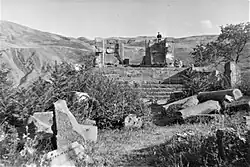 In 1949 the Armenian Academy of Sciences began systematic excavations of the Garni fortress led by Babken Arakelyan, with Alexander Sahinian focusing on the temple itself. It was one of the flagship expeditions of Armenia's archaeological community in the post-war period.[118] The idea of its reconstruction was brought to the forefront at the congress of Transcaucasian archaeologists and historians in Yerevan in 1956 presided by Hovsep Orbeli.[108] In December 1968,[105] the Soviet Armenian government officially approved the reconstruction plan of the temple and a group led by Sahinian began reconstruction works in January 1969.[119] Reconstruction was largely completed by mid-1975,[120] almost 300 years after it was destroyed in an earthquake.[35][121]