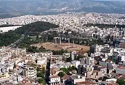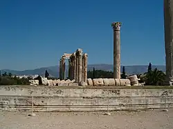 The Temple of Olympian Zeus (Ancient Greek: Ναὸς τοῦ Ὀλυμπίου Διός, Naós tou Olympíou Diós), also known as the Olympieion or Columns of the Olympian Zeus, is a colossal temple in the centre of Athens, now in ruins. It was dedicated to "Olympian" Zeus, a name originating from his position as head of the Olympian gods. Construction began in the 6th century BC during the rule of the Athenian tyrants, who envisioned building the greatest temple in the ancient world, but it was not completed until the reign of Roman Emperor Hadrian in the 2nd century AD, some 638 years after the project had begun. During the Roman period, the temple, which included 104 colossal columns, was renowned as the largest temple in Greece and housed one of the largest cult statues in the ancient world.
