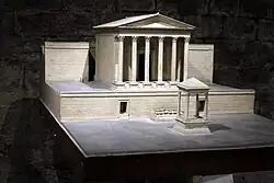 Of the ancient temple, the façade has been preserved, with six Corinthian columns supporting the architrave and a small pediment. The columns were originally covered by a very strong plaster, which was perhaps colored.[1] The cella was completely demolished during the church's construction, in the 16th century, while a small section of the temple was found in the 20th century near the altar.