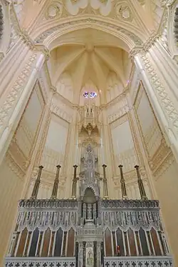 Under the apsidal arch is the high altar, in finely carved stucco with rich neo-Gothic architectural decoration in relief. Above the mensa, in the center, is the tabernacle, surmounted by a baldachin with a high cusp with an octagonal base. In the original plan, above this altar was to be a canvas by Michele De Napoli, a copy of which is located on the counterfacade.[39]