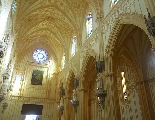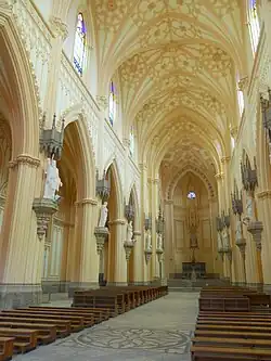 The room is presented as remarkably bright due to the light color of the wall face (cream-colored, with light amber decorative and structural elements) and the numerous windows: these are closed with polychrome geometric stained-glass windows and are, with the exception of the four rose windows, all single-light ogival windows, the ones forming the clerestory of the nave being wide and not very slender, while those of the smaller naves are narrow and high. The bichromatic floor, made of marble from Mount Orlando,[23] is decorated along the nave with several inlaid rose windows that recall the neo-Gothic decorations on the walls.[34]