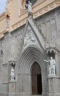 In the lower part, while each of the two lateral naves has a slender ogival single lancet window with wimperg, the central nave has a portal, also in travertine, with a deep spandrel richly decorated in bas-relief with floral motifs.[34] It is surmounted by a high wimperg decorated with a high relief by Salvatore Irdi depicting the allegory of the Restoration of the Papacy and surmounted by a statue by Gennaro Calì depicting St. Francis of Assisi. On either side of the door, under a canopy, are marble statues of Charles II of Anjou (left) and Ferdinand II of the Two Sicilies, both by Gennaro De Crescenzo. Each of them rests on a high polygonal base with an inscription in Latin recalling the ruler's commitment to the Gaetan Church:[35]