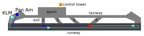 Los Rodeos was a regional airport that could not easily accommodate all of the traffic diverted from Gran Canaria, which included five large airliners.[19] The airport had only one runway and one major taxiway running parallel to it, with four short taxiways connecting the two. While waiting for Gran Canaria airport to reopen, the diverted planes took up so much space that they had to park on the long taxiway, making it unavailable for the purpose of taxiing. Instead, departing aircraft needed to taxi along the runway to position themselves for takeoff, a procedure known as a backtaxi or backtrack.[4]
