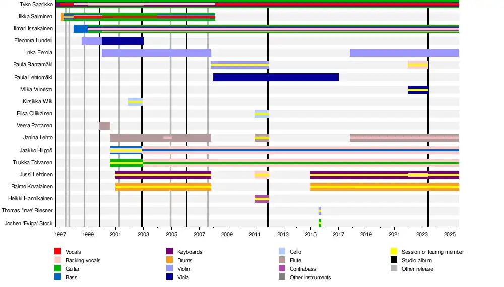 - Tyko Saarikko – acoustic guitar (1996–present), electric guitar (1996–1997), synthesizer (1996–present), vocals (1997–present), didgeridoo (1999–2002), Jew's harp (1999–2002), udu (2000–2002), piano (2004–present), harmonium (2004–2011, 2014–present), percussions (2004–2006)