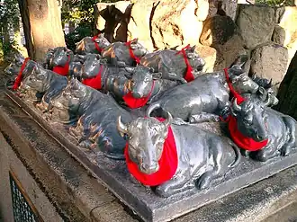 The animal particularly associated with Tenjin is the bull because, according to legend, during Michizane's funeral procession, the bull pulling the cart bearing his remains refused to go any further than a certain spot, which was then built up into his shrine.