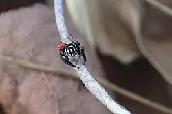 Day active individuals were found to rest in silken retreats constructed in curled dry leaves. A female was also observed in captivity, which laid eggs twice during the period and in the absence of leaves it was found in the corners of aquariums at night. It avoided mosquitoes, houseflies and ants but lavishly fed on fruit flies (of unspecified spp. of the Tephritidae or Drosophilidae families), on one instance, when 30 fruit flies were released into the box with the female, all of them were consumed in the same day. It guarded it's egg sac and ventured out only for capturing prey when the fruit flies were released in the box. A second egg sac was laid after a gap of about ten days and cannibalism among the newly hatched spiderlings was observed. While it took about 2 hours and 40 minutes for a spiderling to consume a fruit fly, it was about 15 minutes for the female.[2]