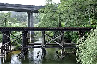 ![]() The creek passes under U.S. Route 101 and a railway trestle after leaving Tenmile Lake. | |
