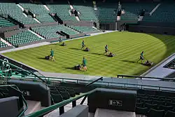 Grass courts are the fastest type of courts in common use.[7] They consist of grass grown on very hard-packed soil, which adds additional variables: bounces depend on how healthy the grass is, how recently it has been mowed, and the wear and tear of recent play.[12] Points are usually very quick where fast, low bounces keep rallies short, and the serve plays a more important role than on other surfaces. Grass courts thus tend to favour serve-and-volley tennis players.