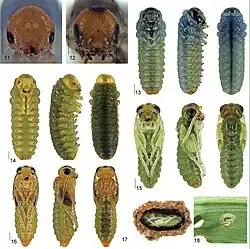 Tenthredinidae is the largest family of sawflies, with well over 7,500 species worldwide,[2] divided into 430 genera. Larvae are herbivores and typically feed on the foliage of trees and shrubs, with occasional exceptions that are leaf miners, stem borers, or gall makers. The larvae of externally feeding species resemble small caterpillars. As with all hymenopterans, common sawflies undergo complete metamorphosis.