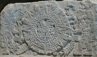 The upper part of the front of the sculpture contains a solar disk flanked by two figures; within the disk is the date Four Movement. The figures are identified as Huītzilōpōchtli (left) and Tepēyōllōtl, a form of Tezcatlipoca (right).