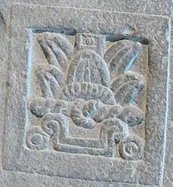 Next to the figure of Tezcatlipoca is a hieroglyph containing the hair, ear plug, nose plug, and royal diadem of a ruler. This symbol is dubbed by Umberger the "Headdress Glyph".[3]