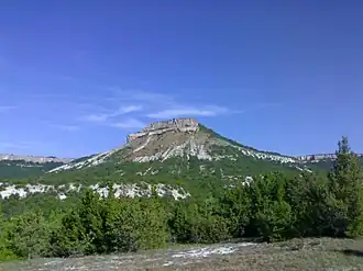 Tepe-Kermen (Crimean Tatar: Töpe Kermen; Ukrainian and Russian: Тепе-Кермен) is a butte and an early medieval settlement in the Bakhchysarai Raion of Crimea. It is located 7 km southeast of Bakhchysarai, and 2 km northeast of the settlement Kyz-Kermen. Its height is 544 meters. The easiest way to climb the mountain is from the northern slope. There are two paths leading to the top.