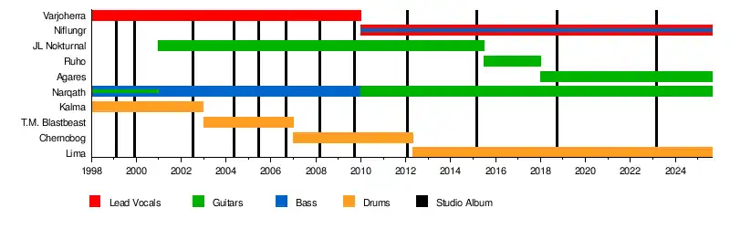 - Narqath - Guitar, bass, vocals, keyboard (ex-Calm (Fin), ex-Decay's Delight, Finnugor, ex-Hellkult, ex-Hin Onde, ex-Necromortum, ex-Oath of Cirion, ex-Svartalfheim (Fin), Svartkraft, ex-Thoronath, ex-Valar, Vultyr, Weltraum, With Hate I Burn, Wyrd)