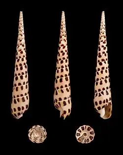 Shells of Terebra subulata can reach a length of 115 mm (4.5 in) and a width of 16 mm (0.63 in).[2] They have about 25 well-rounded whorls and a pointed spire. The aperture is very small and the outer lip is thin. The columella is twisted and the fasciole small. The anterior canal is truncated and curved. The shell is sculptured with fine axial threads and irregular weak spiral grooves, and the area below the suture raised into a spiral band. The color of the shell is cream with two rows of dark brown square blotches on the early whorls and three rows on the body whorl.[3]