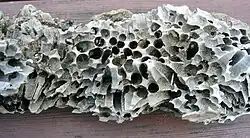 Teredo navalis has an elongated, reddish, wormlike body which is completely enclosed in a tunnel it has made in floating or submerged timber. At the front end of the animal are two triangular, calcareous plates. These are up to 2 cm (3⁄4 in) long and correspond to the valves of other bivalve molluscs. They are white, with a covering of pale brown periostracum, and have rough ridges. The mollusc uses them to grasp the wood and slowly enlarges the burrow in which it lives. It has retractable inhalant and exhalant siphons which project through a small hole in the horny septum which blocks the opening of the burrow. When the animal is threatened, the siphons can be drawn inside the burrow and protected by a pair of calcareous oar-like pallets. The tunnel is circular in cross section and is lined with calcareous material extruded by the mollusc. It can be up to 60 cm (24 in) long and 1 cm (1⁄2 in) in diameter.[3][4] They are edible, and are traditionally consumed on the island of Marajó[2] and parts of Thailand. They are commonly described as tasting like clam or oyster, and are often prepared in similar ways.[5]