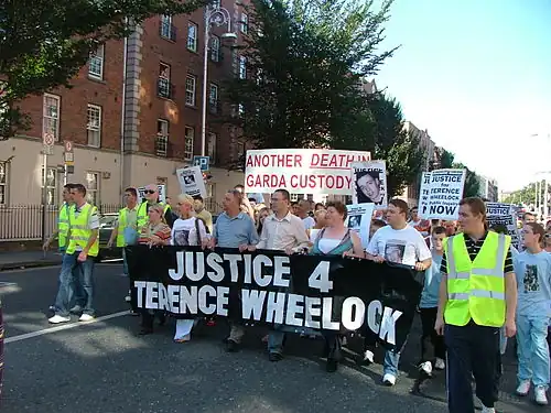 There were protests in favour of an independent inquiry into the death of Terence Wheelock in many locations including Store Street Garda Station, Dáil Éireann, and the Minister for Justice.[8]