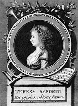 Between 1788 and 1789, she sang in Venice at the Teatro Venier as Mandane in Ferdinando Bertoni's Artaserse (November 1788); as Selene in the world premiere of Pietro Alessandro Guglielmi's Arsace (26 December 1788); and as Armida in the world premiere of Guglielmi's Rinaldo (28 January 1789). She then appeared at La Scala where on 20 April 1789 she sang the title role in the world premiere of Francesco Bianchi's Nitteti.[5] She went on to perform in Parma, Modena, Bologna, Vienna, Moscow, and Saint Petersburg. In Saint Petersburg she was the prima buffa assoluta in Gennaro Astarita's opera company and sang in operas by Astarita, Giovanni Paisiello, and Domenico Cimarosa.[6] Saporiti also composed two arias, "Dormivo in mezzo al prato" and "Caro mio ben, deh senti", which were published in 1796.
