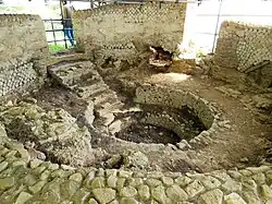 The republican baths were entered through an atrium with a mosaic floor depicting stars and diamonds. This led to the large exedra (semicircular hall) (7) probably for changing and exercise, with the "small exedra" adjacent to it. The oldest room of the baths was the adjacent domed round bath (4) of the 2nd century BC originally fed by hot spring water. Under Hadrian the bath was converted into a laconicum or sudatorium (dry heat bath) by supporting a new marble floor on brick columns for heating from below.[14]