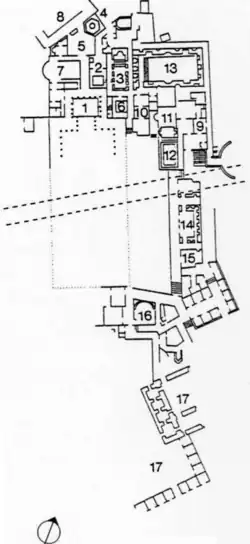 The Hadrianic part can be identified by some characteristic decorative elements and above all by at least five individual latrines as in Hadrian's Villa, which may have been reserved for use by VIPs such as the emperor. Some can be found in the vicinity of the large calidarium and in the cryptoporticus, one is near the winter triclinium with hypocaust.[16]