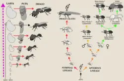 The primitive giant northern termite (Mastotermes darwiniensis) exhibits numerous basal characteristics similar to other cockroaches that are not shared with other termites, such as laying its eggs in rafts and having anal lobes on the wings.[49] Termites are sometimes called "white ants", but the only resemblance to the ants is due to their sociality which is due to convergent evolution[50][51] with termites being the first social insects to evolve a caste system more than 100 million years ago.[52] Termite genomes are generally relatively large compared to those of other insects; the first fully sequenced termite genome, of Zootermopsis nevadensis, which was published in the journal Nature Communications, consists of roughly 500Mb,[53] while two subsequently published genomes, Macrotermes natalensis and Cryptotermes secundus, are considerably larger at around 1.3Gb.[54][51]