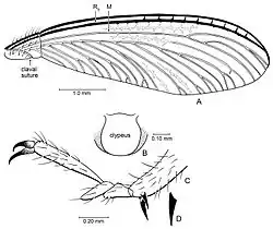 The oldest unambiguous termite fossils date to the early Cretaceous, but given the diversity of Cretaceous termites and early fossil records showing mutualism between microorganisms and these insects, they possibly originated earlier in the Jurassic or Triassic.[38][39][40] Possible evidence of a Jurassic origin is the assumption that the extinct mammaliaform Fruitafossor from Morrison Formation consumed termites, judging from its morphological similarity to modern termite-eating mammals.[41] Morrison Formation also yields social insect nest fossils close to that of termites.[42] The oldest termite nest discovered is believed to be from the Upper Cretaceous in West Texas, where the oldest known faecal pellets were also discovered.[43] Claims that termites emerged earlier have faced controversy. For example, F. M. Weesner indicated that the Mastotermitidae termites may go back to the Late Permian, 251 million years ago,[44] and fossil wings that have a close resemblance to the wings of Mastotermes of the Mastotermitidae, the most primitive living termite, have been discovered in the Permian layers in Kansas.[45] It is even possible that the first termites emerged during the Carboniferous.[46] The folded wings of the fossil wood roach Pycnoblattina, arranged in a convex pattern between segments 1a and 2a, resemble those seen in Mastotermes, the only living insect with the same pattern.[45] Kumar Krishna et al., though, consider that all of the Paleozoic and Triassic insects tentatively classified as termites are in fact unrelated to termites and should be excluded from the Isoptera.[47] Other studies suggest that the origin of termites is more recent, having diverged from Cryptocercus sometime during the Early Cretaceous.[48]