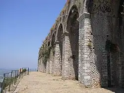 Above the town are several massive terrace platforms for supporting buildings; these may well belong to the Roman period, and the latter even to the Empire. The summit of the promontory, elevation 227 metres (745 ft), is reached by the old line of the Via Appia, which is flanked by tombs and by remains of an ancient defensive wall with circular towers, the so-called Cinta Sillana (once attributed to Theodoric, but dating from the first decades of the 1st century BCE). The summit is occupied by a large terrace, supported by arcades of fine opus incertum (traditionally, but wrongly, called the "palace of Theodoric") on all sides except the east, with views seaward over the coast and over the Pontine Marshes.[4]