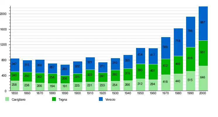 The earliest trace of a settlement in the area come from the Bronze Age. Other artifacts have been found from the Iron Age and Roman era tombs and coins from the 1st to 3rd century. The modern municipality of Cavigliano is first mentioned in 1213 as Caveliano. In 1591 it was mentioned as Caviano, Pedemonte di sopra and Terra di cima.[4] During the Middle Ages the village was part of the Locarno and Ascona region, and it paid a tithe to the Capitanei of Locarno. During this time the villages of Cavigilano, Tegna, Verscio and Auressio formed the municipality of Pedemonte. Tegna left Pedemonte in 1464 to form an independent municipality. In the 16th century it became part of the bailiwick of Locarno. The village evolved into an independent political municipality in 1803.