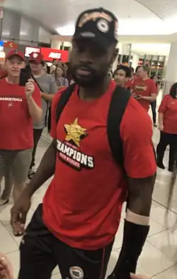On July 27, 2018, White signed with the Perth Wildcats for the 2018–19 NBL season.[27] He promised head coach Trevor Gleeson to bring a championship to Perth.[28] He endured knee and hamstring injuries throughout the campaign,[28][29] but battled through the regular season to only miss a handful of games.[28] A wrist injury required him to wear a cast on his left arm at the end of the regular season and during the finals.[28][30] White received criticism throughout the season for not seizing control of games,[31] but stepped up in the playoffs with 19 and 24 point games during the semifinal wins over the Brisbane Bullets, and scored 19, 17, 31 and 20 points in the four grand final matches, helping the Wildcats defeat Melbourne United 3–1 behind another championship series MVP.[28][32]