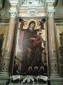 About 1120 William of Vercelli founded an abbey of eremitic inspiration dedicated to the Holy Virgin. It was consecrated in 1124 on Mons Sacer, so called because of the ruins of a temple of Cybele.[1] Catherine of Valois and her son, Louis I of Naples, are buried in the abbey. The new basilica, built in 1961, is home to a 13th-century Byzantine icon of a black Madonna.[2] In 1926 it was established as the Territorial Abbacy of Montevergine.