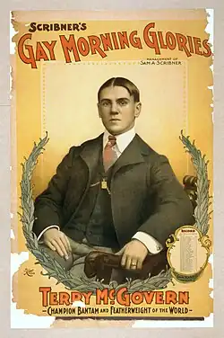 Terrible Terry McGovern (March 9, 1880 – February 22, 1918) was an American professional boxer who held the World Bantamweight and Featherweight Championships.[1][2] He was born in Johnstown, Pennsylvania as John Terrence McGovern.[3][4] Through most of his career he was managed by Sam H. Harris, who remained a lifelong friend. Many boxing historians considered McGovern's greatest attributes his punching ability and signature charges rather than his boxing style or defensive technique. That the majority of his wins were by knockout speaks to the power of his punch.[5]