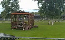 Terry Miller Memorial Park on an early morning in June 2011. Tanker cars parked at an Alaska Railroad siding, serving the now-closed oil refinery which was a major part of North Pole's economy for several decades, can be seen in the background.