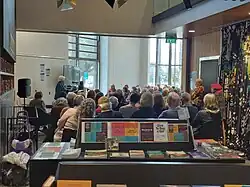Tessa Duder giving a talk in Devonport Library, Auckland, 2024.