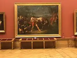 Discussing Ugryumov's work, art historian Andrey Karev wrote that "to the greatest extent the possibilities of his skill and features of temperament were embodied in the painting 'Testing the strength of Jan Usmar'".[50] According to Karev, "victory over the bull is a kind of symbol of victory over all enemies of Russia" and, in addition, represents "the triumph of civilisation over savagery and, ultimately, of reason over dark passions."[51] Moreover, Karev argues that an analogy can be drawn between Usmar's test of strength and one of Heracles' labours - the taming of the Cretan Bull - since both events involved a struggle with an enraged animal. Karev also noted that Ugryumov's painting reflects the influence of the Baroque style, likely tied to the artist's aim to "find means of expression equivalent to the scene, referring both to the sphere of strong passions in general and to the circumstances of the turbulent, heroic period of domestic antiquity."[50]