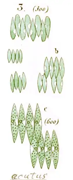 | Tetradesmus obliquus (as Scenedesmus acutus), drawn by Carl Nägeli in 1849) | |
