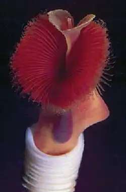 The giant tube worm lives inside a long narrow tube made from a chitin, that is the hard material of its outer skeleton, and it attaches to the ocean floor.[3] It possesses a retractable plume that is extended when the worm is not disturbed. Its size can go up to 2 metres (6.6 ft) tall. The plume is a complex structure that has tightly stacked sheets of tentacles forming a gill-like organ.[4] This is used to take up nutrients from the surrounding waters. The plume also has blood vessels containing large amounts of haemoglobin, which gives the animal a blood-red colouration.[5] Its juvenile larvae are mobile and can move from different vents.[6]
