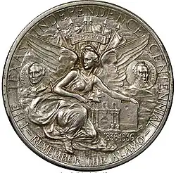 The Texas Centennial half dollar was a commemorative fifty-cent piece struck by the U.S. Bureau of the Mint for collectors from 1934 to 1938. It features an eagle and the Lone Star of Texas on the obverse, while the reverse is a complex scene incorporating the winged goddess Victory, the Alamo Mission, and portraits of Texan founding fathers Sam Houston and Stephen F. Austin, together with the six flags over Texas. Proposed by the American Legion's Texas Centennial Committee as a fundraising measure for the 100th anniversary of Texas's independence from Mexico, the coin's issue was approved by Congress in 1933, ending a multi-year pause on new commemorative issues under the Hoover administration. It was designed by sculptor Pompeo Coppini, previously the designer of several Texan public monuments. Rough models of the coin were approved by the committee in May 1934, but rejected by the U.S. Commission of Fine Arts, who viewed the design as crowded and overly-complicated. A compromise was reached, and the coin entered production at the Philadelphia Mint in October 1934.