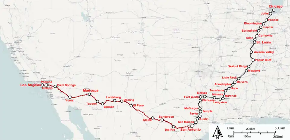 | Termini | Chicago, Illinois San Antonio, Texas or Los Angeles, California | ||||||||||||||||||||||||||||||||||||||||||||||||||||||||||||||||||||||||||||||||||||||||||||||||||||||||||||||||||||||||||||||||||||||||||||||||||||||||||||||||||||||||||||||||||||||||||||||||||||||||||||||||||||||||||||||||||||||||||||||||||||||||||||||||||||||||||||||||||||||||||||||||||||||||||||||||||||||||||||||||||||||||||||||||||||||||||||||||||||||||||||||||||||||||||||||||||||||||||||||||||||||||||||||||||||||||||||||||||||||||||||||||||||||||||||||||||||||||||||||||||||||||||||||||||||||||||||||||||||||||||||||||||||||||||||||||||||||||||||||||||||||||||||||||