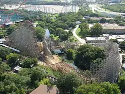 Renovations began almost immediately and involved the removal of all of the wooden track and modifications to some of the support structure.[7] On March 3, 2010, Six Flags Over Texas and Rocky Mountain Construction (RMC) unveiled the steel I-Box track which would be used on the refurbished ride. The track was developed over the course of three years by RMC owner Fred Grubb, and Ride Centerline, LLC engineers Alan Schilke and Dody Bachtar.[9][10] The steel track was designed to be a replacement for any existing wooden track structure, with the rail shape, approximate weight, and dimensions remaining the same.[9][11] Schilke designed the modifications to the layout, giving specifications to Grubb for manufacturing at RMC's Idaho plant. There, two-dimensional plates of steel were machine-welded to form the three-dimensional track parts.[9] The redevelopment saw much of the track get reprofiled; the lift hill was increased by 10 feet (3.0 m), the first drop was steepened to 79 degrees, and several overbanked turns (ranging from 90° to 115°) were added.[7][11] In October 2010, Six Flags announced that the renovated ride would be called the New Texas Giant.[12] It opened on April 22, 2011.[8]