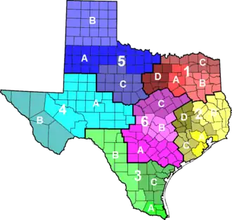 The Texas Highway Patrol is divided into seven regions and nineteen districts.[3] Historically, these regions were numbered I-VII, but were assigned geographic nomenclature in 2018 in order to facilitate easier identification by the public.[4]