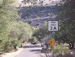 PR 3's 1.2-mile (1.9 km)[1] main road begins at SH 118. Immediately after the intersection, PR 3 divides into two one-way roadways separated by the park headquarters and reuniting just beyond.[3] The road then continues westward through Keesey Canyon one-half mile (0.8 km) passing a couple of small hiking trails to the intersection with PR 3A. Beyond PR 3A, several drives branch off as loops accessing campsites, staff residences, and other park facilities. The road makes a sharp curve and a steep upward grade before ending at Indian Lodge 1.2-mile (1.9 km) west of the intersection with PR 3A.[3][4]