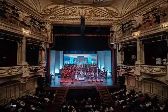 Théâtre Mogador (French pronunciation: [teɑtʁ mɔɡadɔʁ]), founded in 1913 with design by Bertie Crewe, is a Parisian music hall theatre located at 25, Rue de Mogador in the 9th arrondissement. It seats 1,600 people on three tiers (orchestra: 787 seats, boxes: 432 seats, balconies: 381 seats).