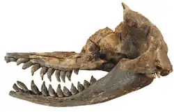 The Pisco Formation of Peru is known for its wide assemblage of marine vertebrates. Several whales are known, most commonly the mid-sized cetotheriid baleen whales; other whales found are the rorqual baleen whale Balaenoptera siberi, the beaked whale Messapicetus gregarius, the pontoporiid dolphin Brachydelphis mazeasi, some oceanic dolphins, the tusked dolphin Odobenocetops, and the macroraptorial sperm whales Acrophyseter and Livyatan.[25][26] Other vertebrates include the seals Acrophoca and Hadrokirus, sea turtles such as Pacifichelys urbinai, the gavialid Piscogavialis, cormorants, petrels, and boobies (Sula spp.). The formation has a large cartilaginous fish assemblage, mainly belonging to the ground sharks, such as requiem sharks and hammerhead sharks; and, to a lesser extent, mackerel sharks, such as white sharks, sand sharks, and Otodontidae. Many shark teeth were associated with the extinct broad-tooth mako (Cosmopolitodus hastalis) and megalodon (Carcharocles megalodon). Other cartilaginous fish include eagle rays, sawfish, and angelsharks. Most of the bony fish findings represent tunas and croakers. Livyatan and megalodon were probably the apex predators.[25][27]