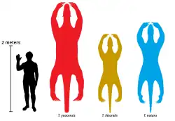 T. natans has the most complete skeleton preserved and measures from snout to tail 2.55 meters (8.4 ft). Based on a femur-to-body-length ratio, the T. littoralis specimen—probably a female—measured 2.1 meters (6.9 ft) in life, and the T. yuacensis specimen 3.3 meters (11 ft).[16]