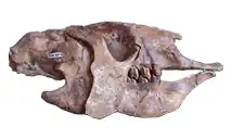 The later Thalassocnus species had enlarged premaxillae and thus had a more elongated snout. The lower jaw progressively elongated and became more spoon-shaped, possibly mimicking the function of the splayed incisor teeth in ruminants. The later species had stronger lips, indicated by the large size of the infraorbital foramen which supplies blood vessels, and, as modern-day grazers, probably had horny pads on the lips. Like in other grazers, the snout had a square shape as opposed to the triangular shape in browsers. The nostrils moved from the front of the snout to the top of the snout, similar to seals.[16] In later species, to adapt to feeding underwater, the soft palate of the mouth separating the trachea from the esophagus was more developed, and the internal nostrils between the nasal cavity and the throat were farther inside the head. This also increased the size of the mouth. However, these adaptations also developed in some terrestrial mammals, and so could instead be related to chewing efficiency. The masseter muscle on the skull was probably the main muscle for biting down. The later species had a more powerful bite to better grasp seagrass. The pterygoid muscle in later species was larger to adapt to grinding rather than cutting while chewing.[14][10] The latest species, T. carolomartini and T. yuacensis show some evidence of having a short trunk similar to tapirs and elephant seals.[17]